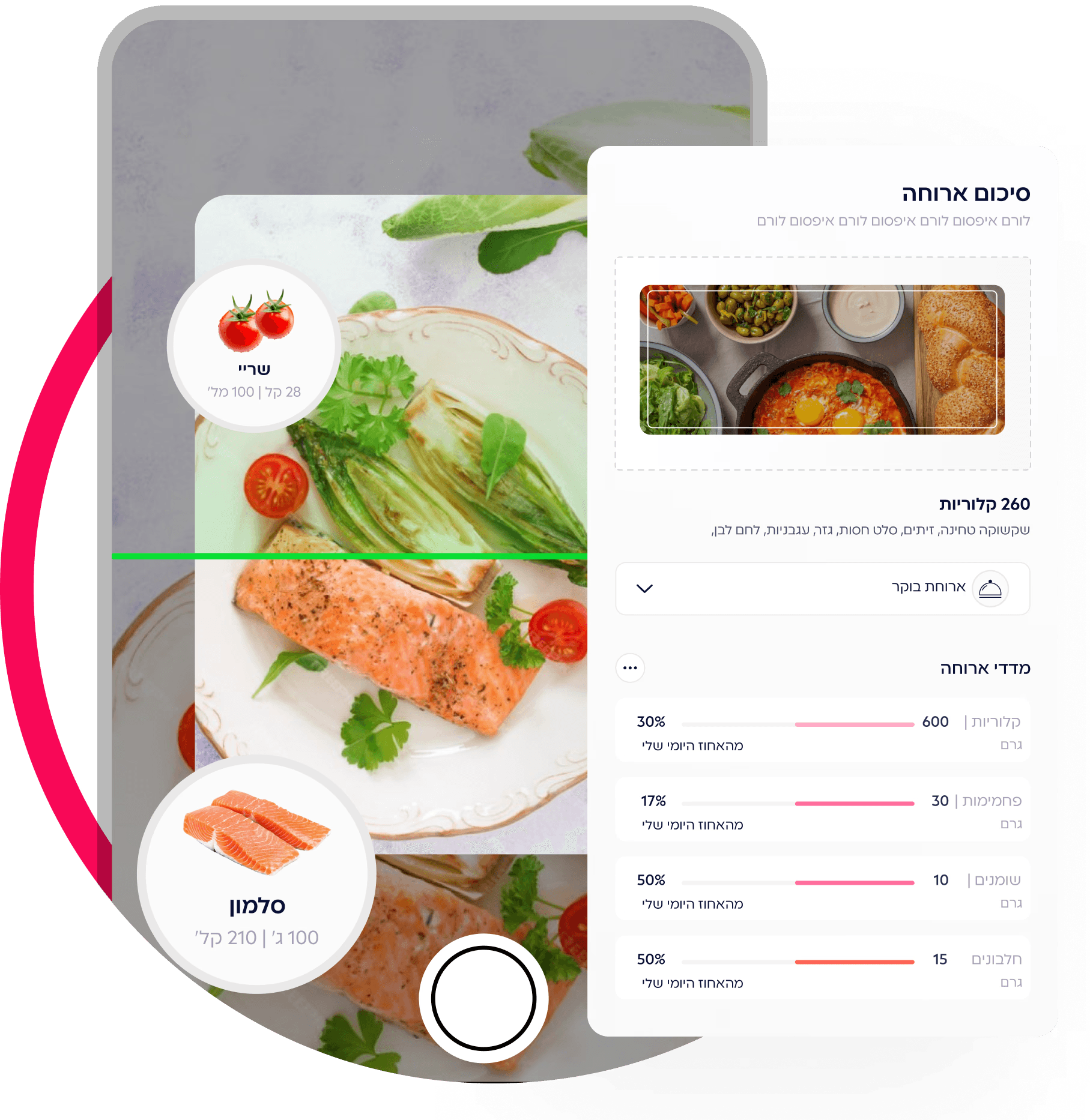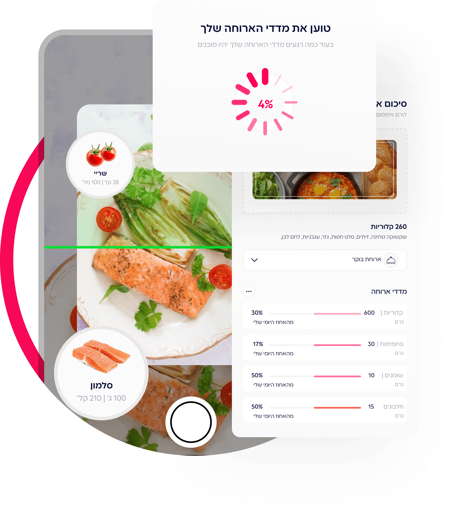 מאגר מתכונים טעימים ומעקב קלורי חכם עם (AI). אפשר לצלם את הצלחת או פשוט לכתוב מה אכלת, והמערכת תחשב את הערכים לבד. בלי טבלאות ובלי חישובים מסובכים.