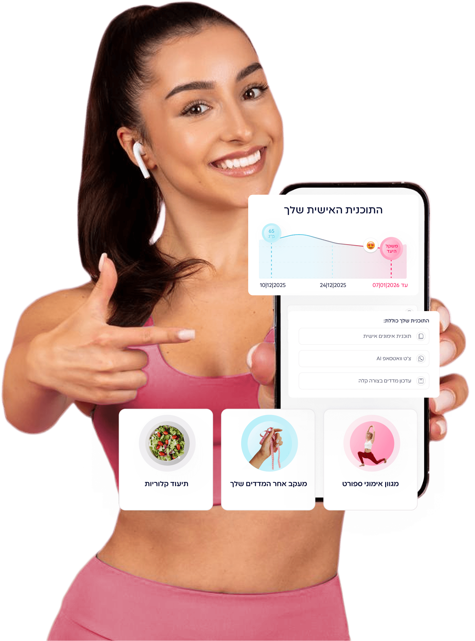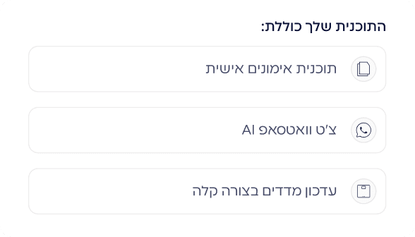 כל הכלים להצלחה במקום אחד: בוט וואטסאפ לתיעוד מהיר, מעקב שבועי אחר היקפים ומדדים, תזכורות חכמות לשתיית מים, והתאמת אימון יומית לפי ה-Mood והאנרגיה שלך באותו רגע.